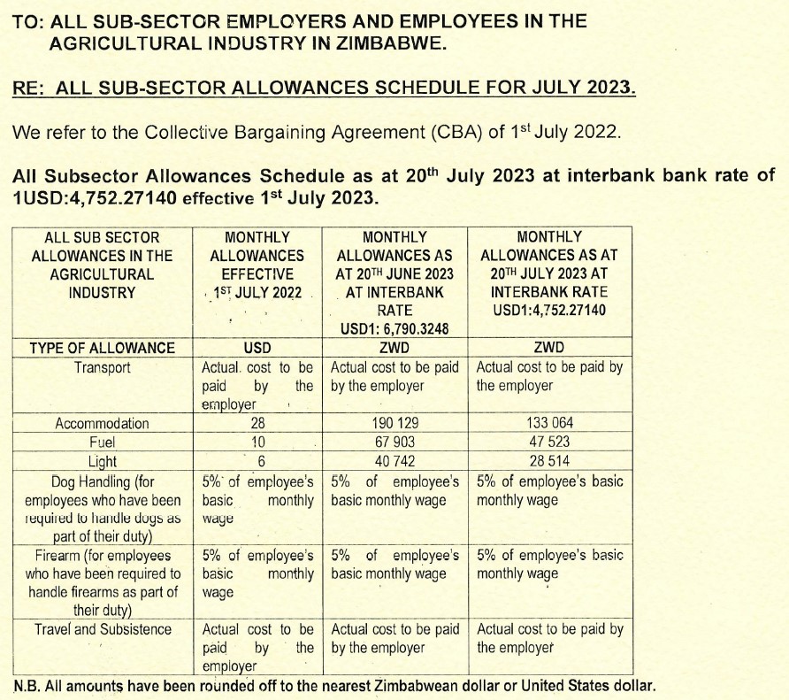 The latest news out of NEC Agriculture is a new base minimum wage as well as a mandated split of that wage in a 40% USD /60% ZWL ratio. The ZWL amounts are to be calculated by taking the applicable ZWL component value due to the employee and converting it at the interbank rate prevailing on the 20th of the month the remuneration is due to the employee. This is how the minimum wage schedule is to work for the rest of the year.